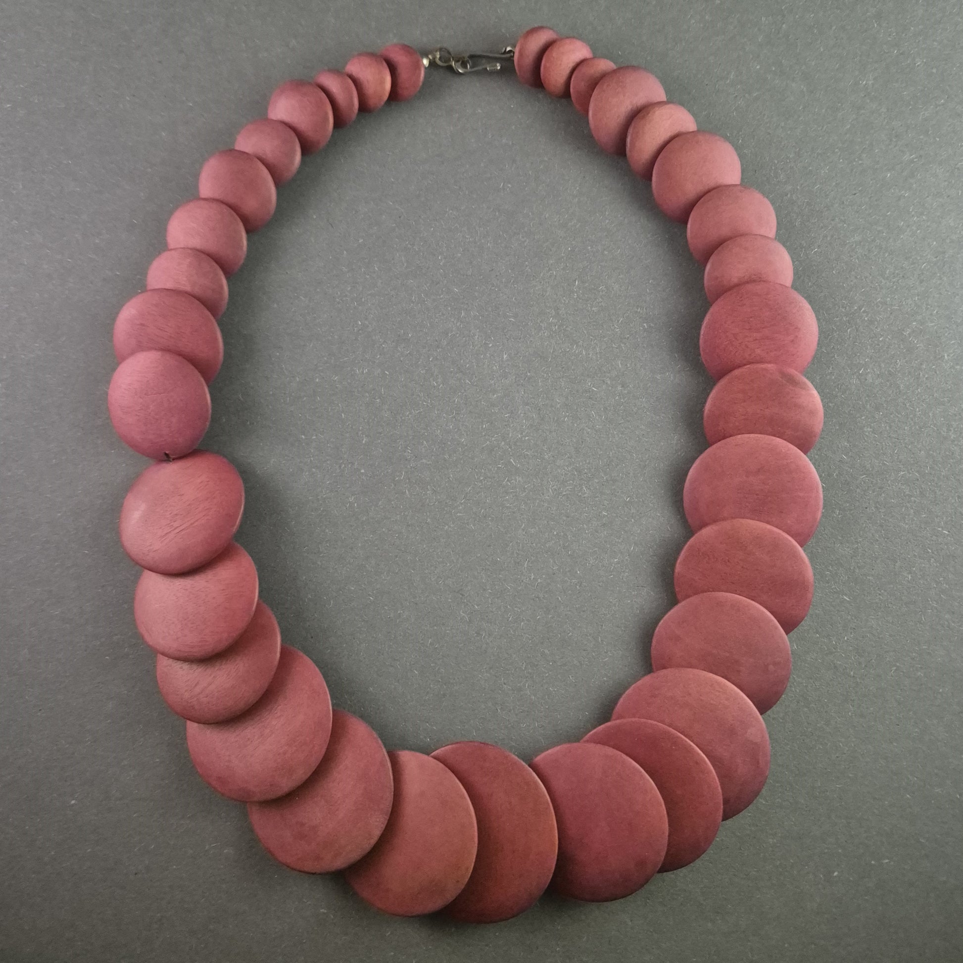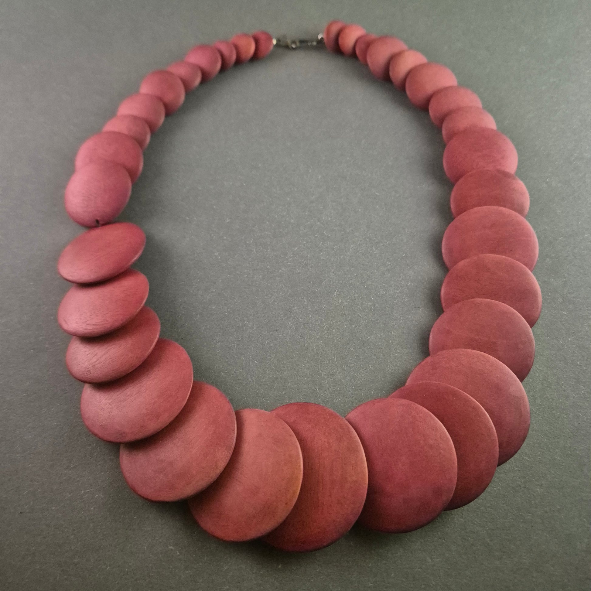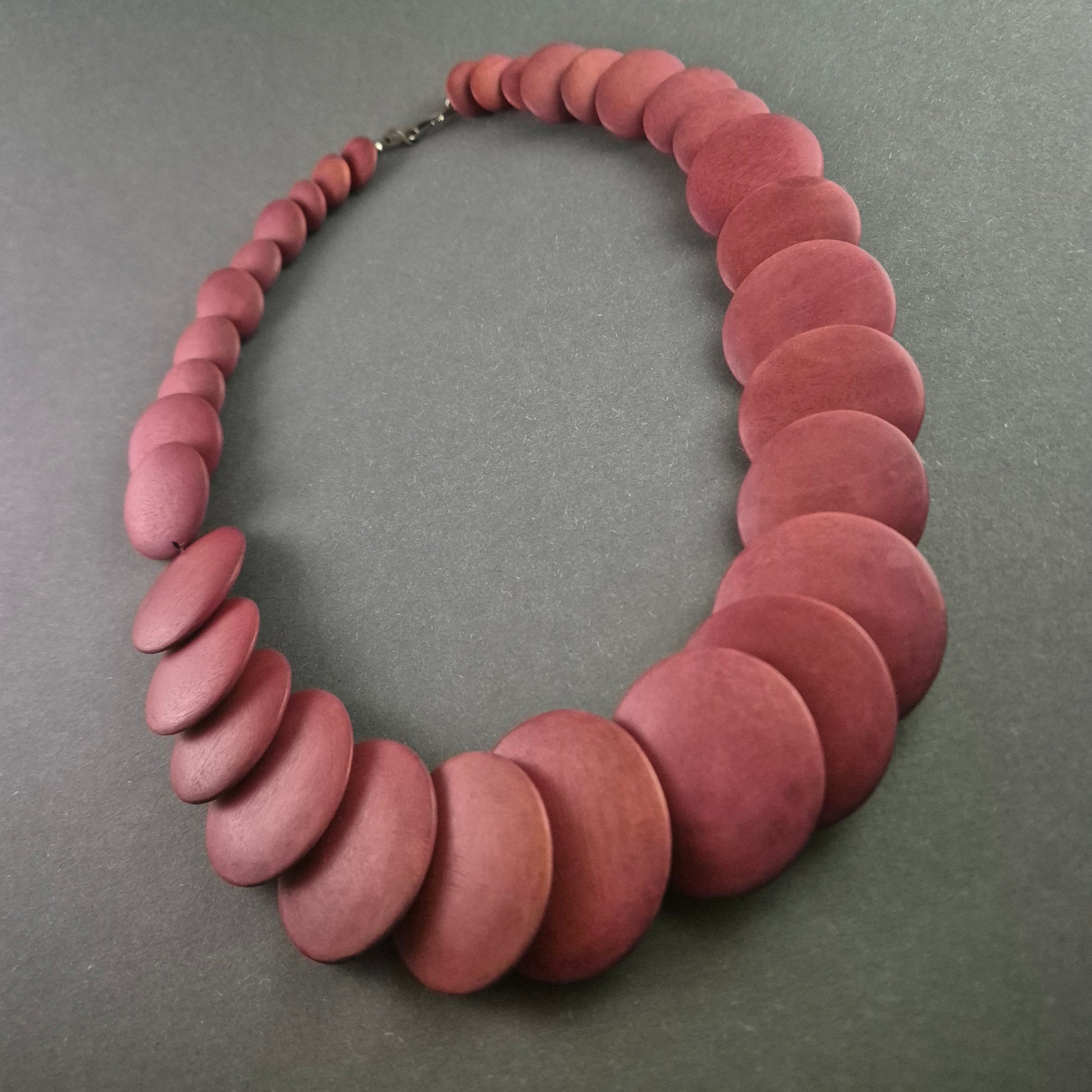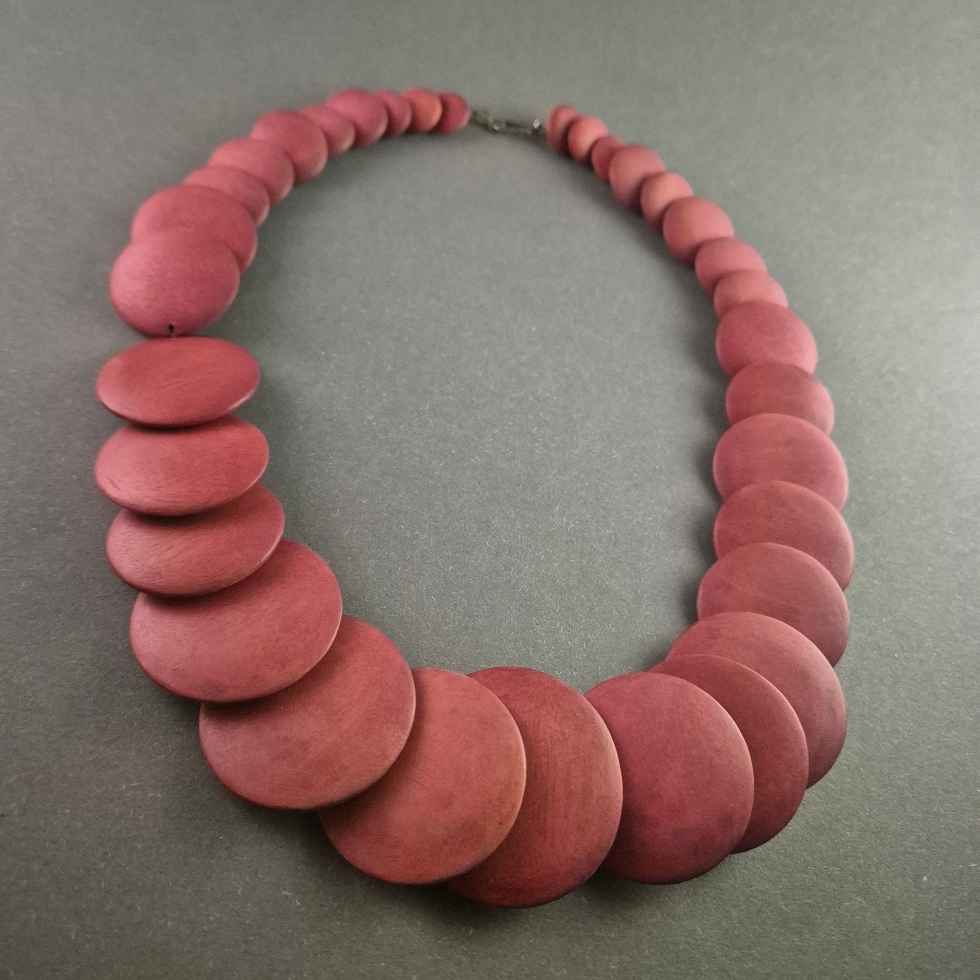 Diese auffällige Statement-Halskette besticht durch ihre großen, runden Glieder in einem satten Rotton. Die mattierte Oberfläche verleiht ihr eine natürliche Holzoptik und sorgt für ein angenehmes Tragegefühl. Perfekt für Liebhaber von außergewöhnlichem Schmuck mit Retro-Charme.