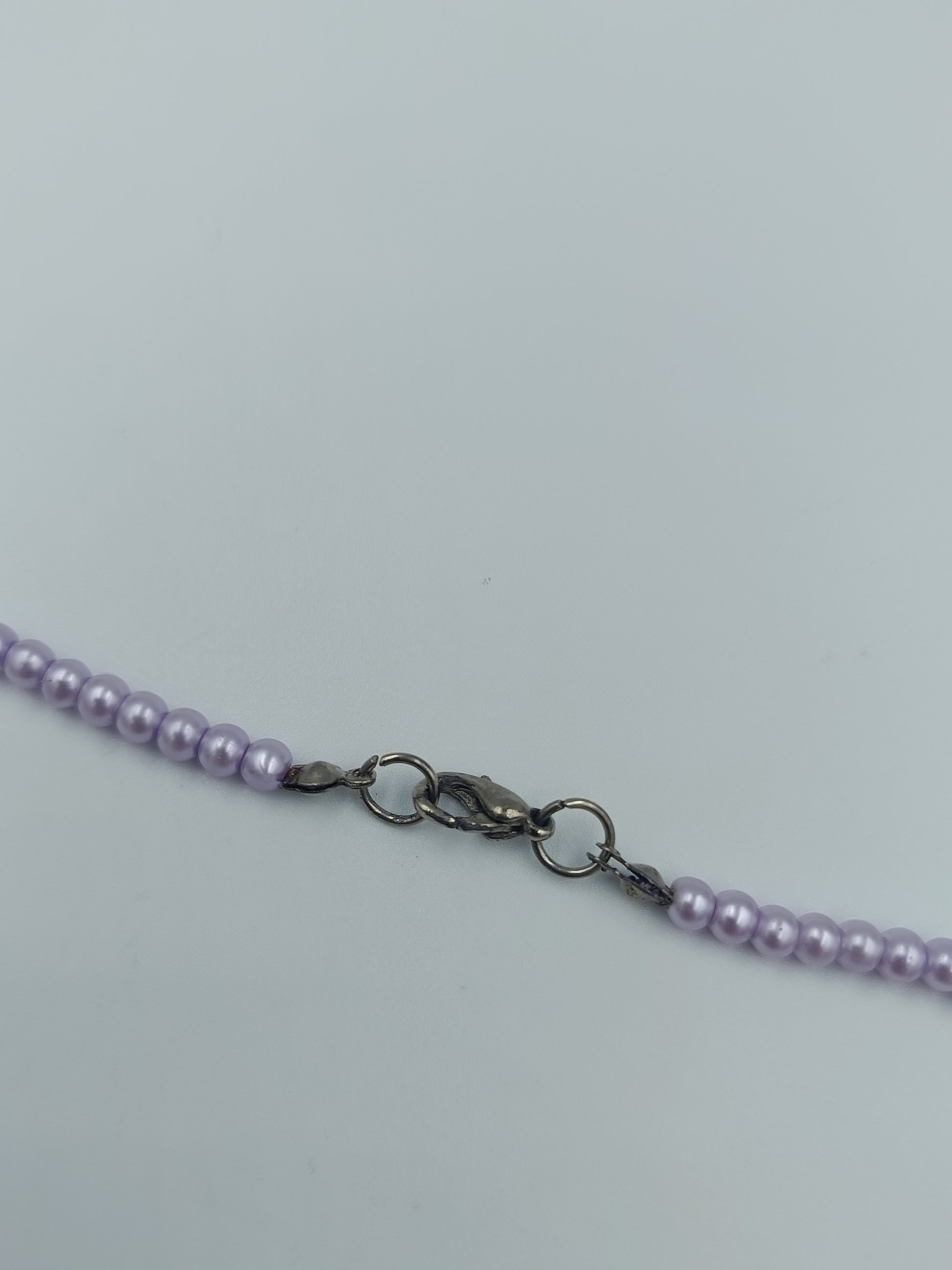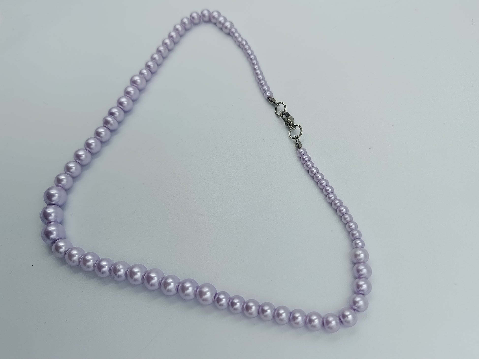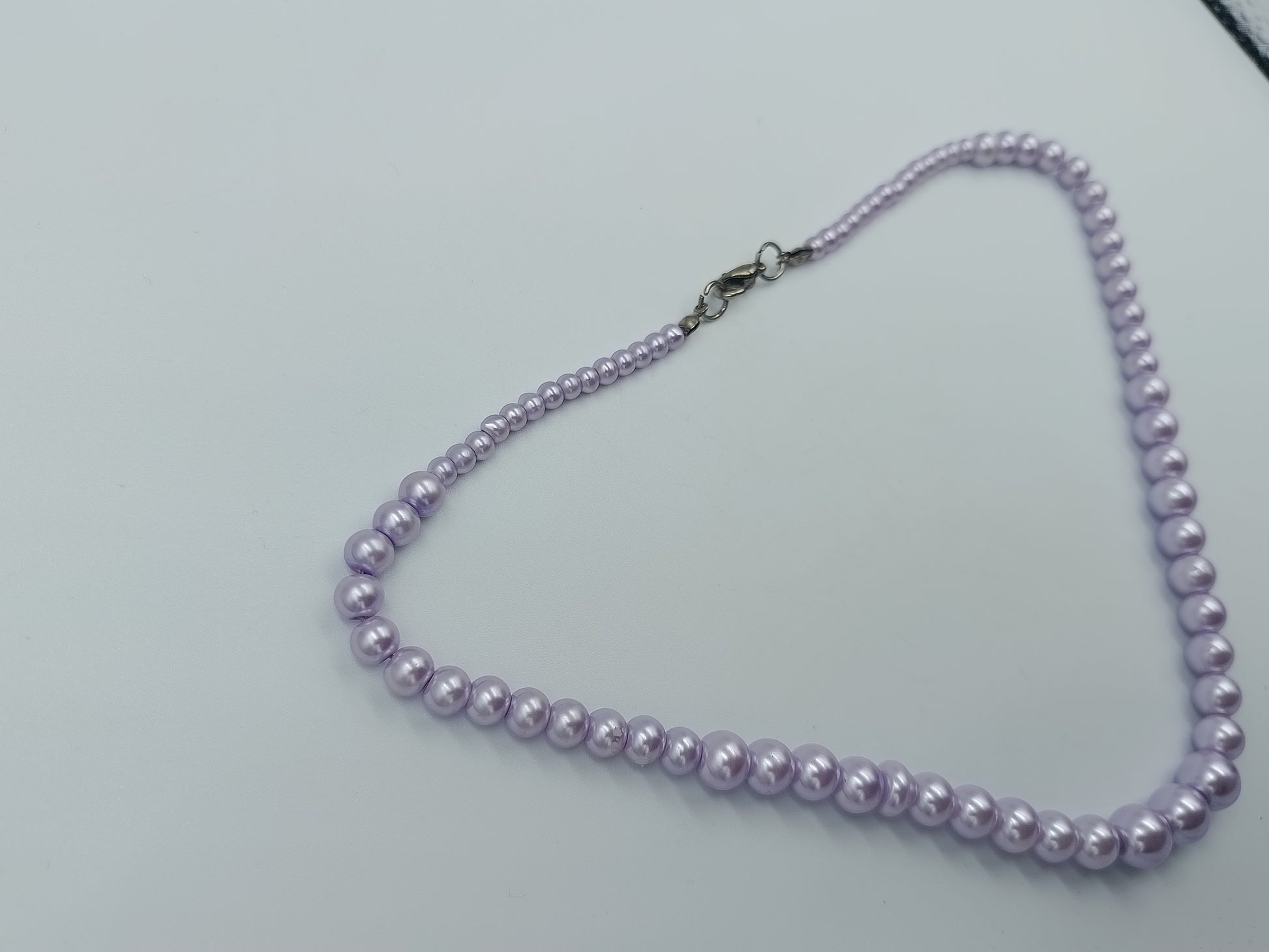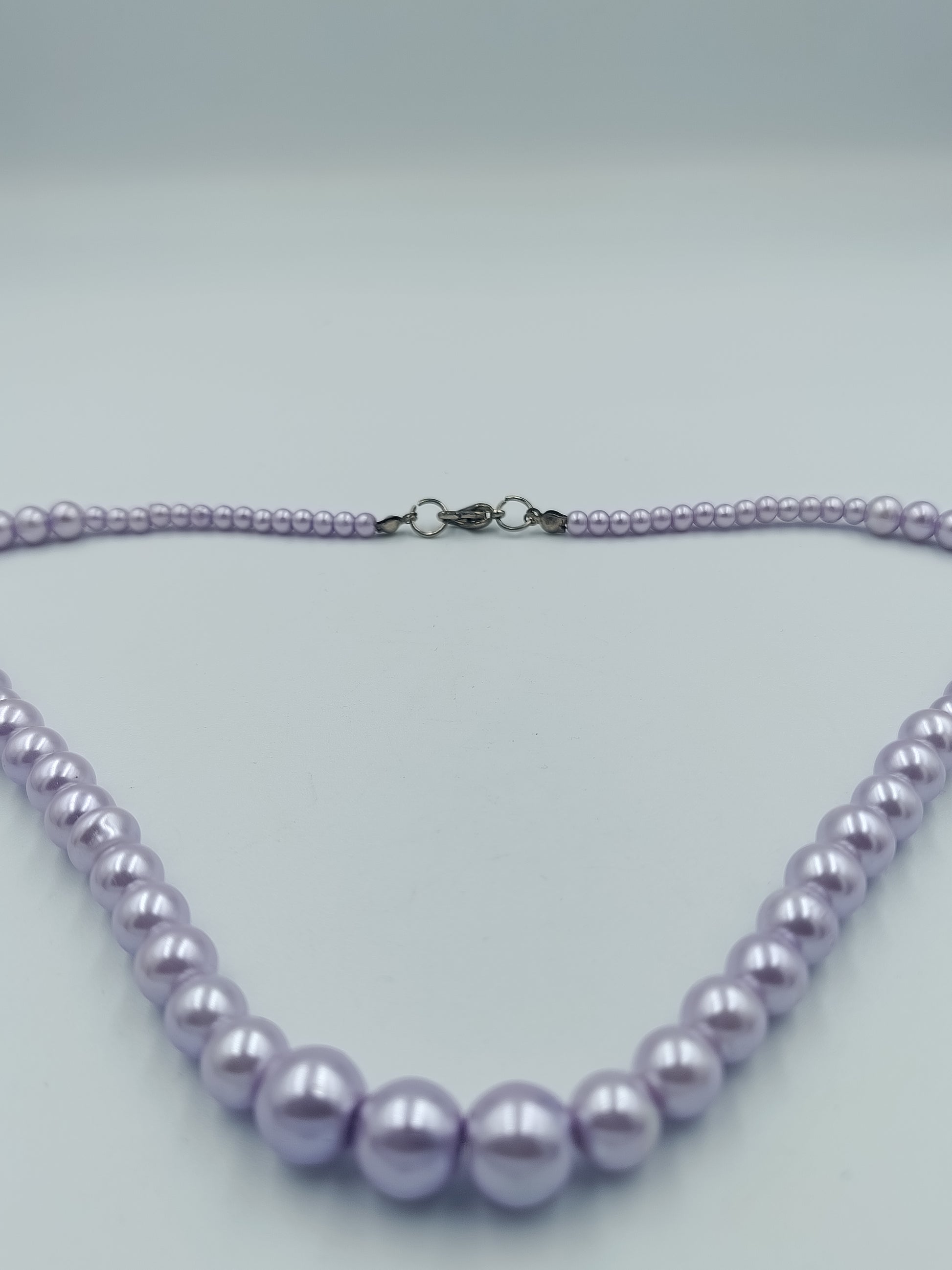 Elegante Halskette aus glänzenden, fliederfarbenen Perlenimitaten. Die sanfte Farbgebung verleiht der Kette eine feminine, romantische Note, die sowohl zu festlichen Anlässen als auch als dezenter Blickfang im Alltag getragen werden kann.