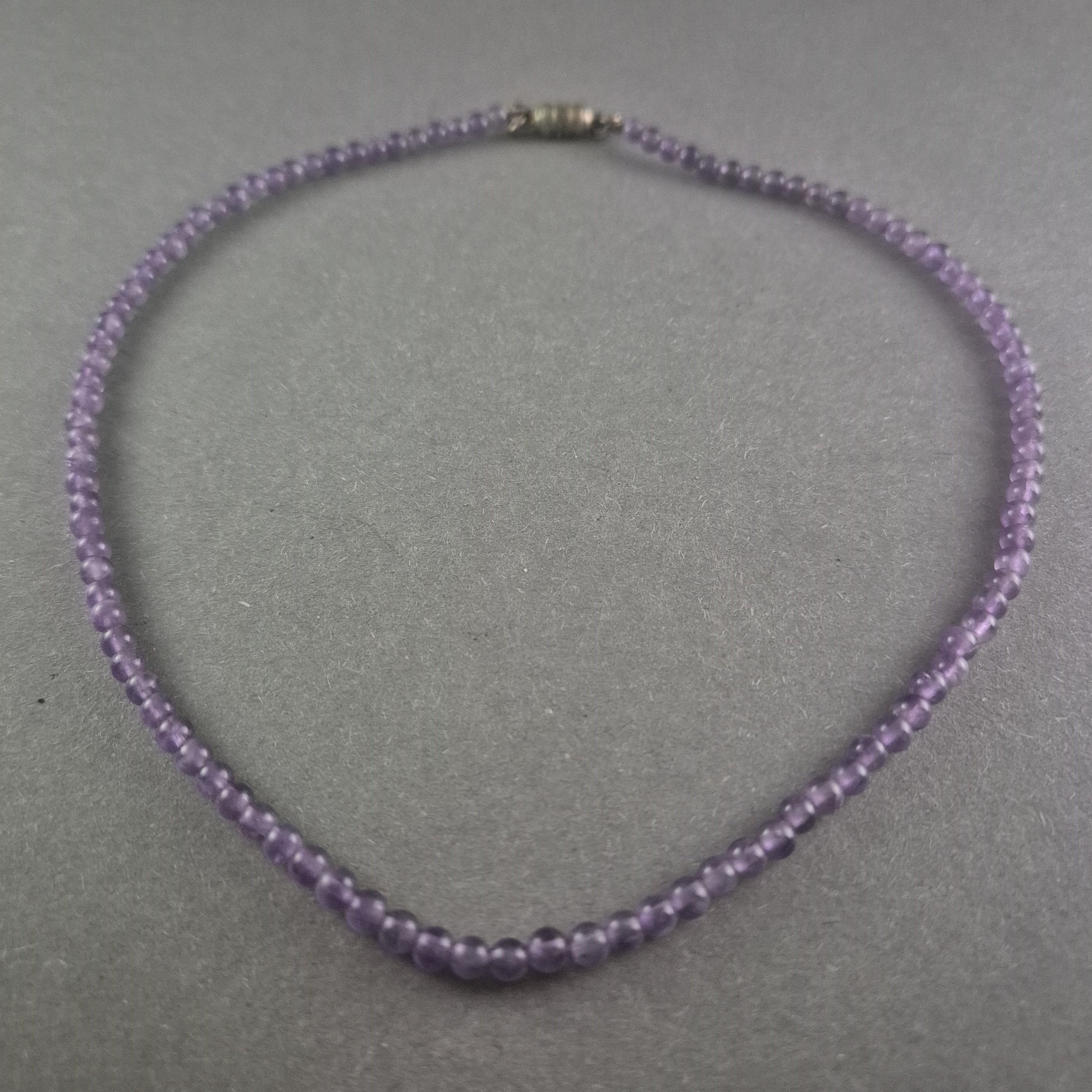 Diese elegante Vintage-Halskette besticht durch ihre feinen Amethyst-Perlen in zartem Violett. Die gleichmäßig geformten, transparent schimmernden Kugeln verleihen der Kette eine dezente Eleganz und machen sie zu einem zeitlosen Accessoire. Perfekt für den Alltag oder besondere Anlässe – ein Must-have für Liebhaber klassischer Schmuckstücke.